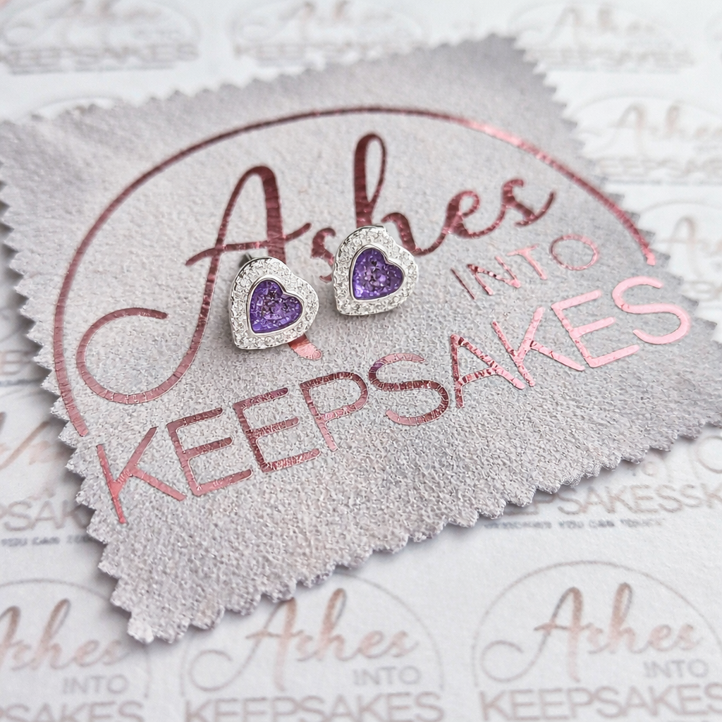 Our earrings are hand crafted to order and we estimate all orders to take around 3-5 weeks from receiving your inclusion. All items come with authenticity certificate with your loved ones name on. Once you have placed and order with Ashes into keepsakes we will send out a pack for you to send your ashes, hair or pets fur back to us, any unused will be returned to you with your order. The completed product will be expertly buffed to create a mirror shine finish, and due to the range of colours we have to choose from no two resin gems are ever the same. Ashes into keepsakes is committed to each one of our customers to provide the best service and care. Your loved ones ashes, hair or even pets fur will be handled with the utmost respect and care, and any unused will be sealed and returned to you with your order. Your orders will be sent to you with a special authenticity certificate with your loved ones name on and the creation date, then hand signed by our designer. To take care of your resin inlaid product, do not expose it to extreme temperatures, if this happens at any point we advise to just leave it sit at room temperature for a small amount of time. We advise to remove when showering, swimming or handling cleaning products. Make sure to not store in direct sunlight. The rings shine can be restored using a branded resin polish, any damage after you have received your jewellery we accept no liability for this, please read on how to care for your jewellery ensuring it lasts a lifetime. We offer a no refunds policy, this is because once your order is placed any jewellery will begin being produced ready for when your inclusion arrives to us. Speedy service is available at the checkout this guarantees your order for a specific date, this needs to be agreed before adding to cart please email us.