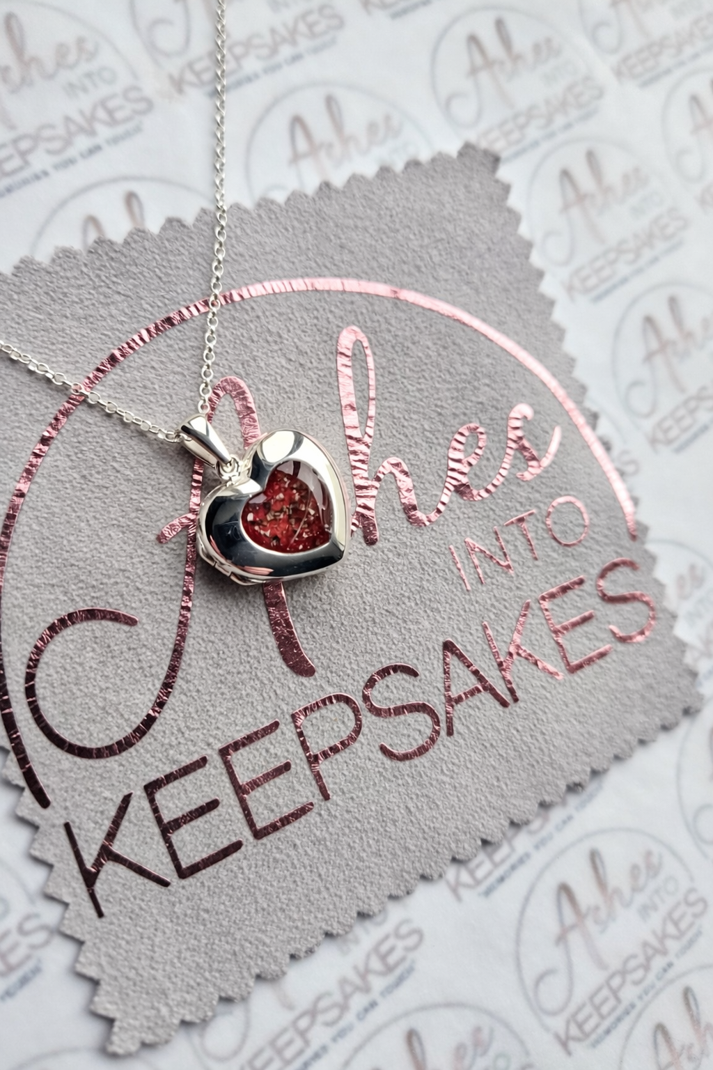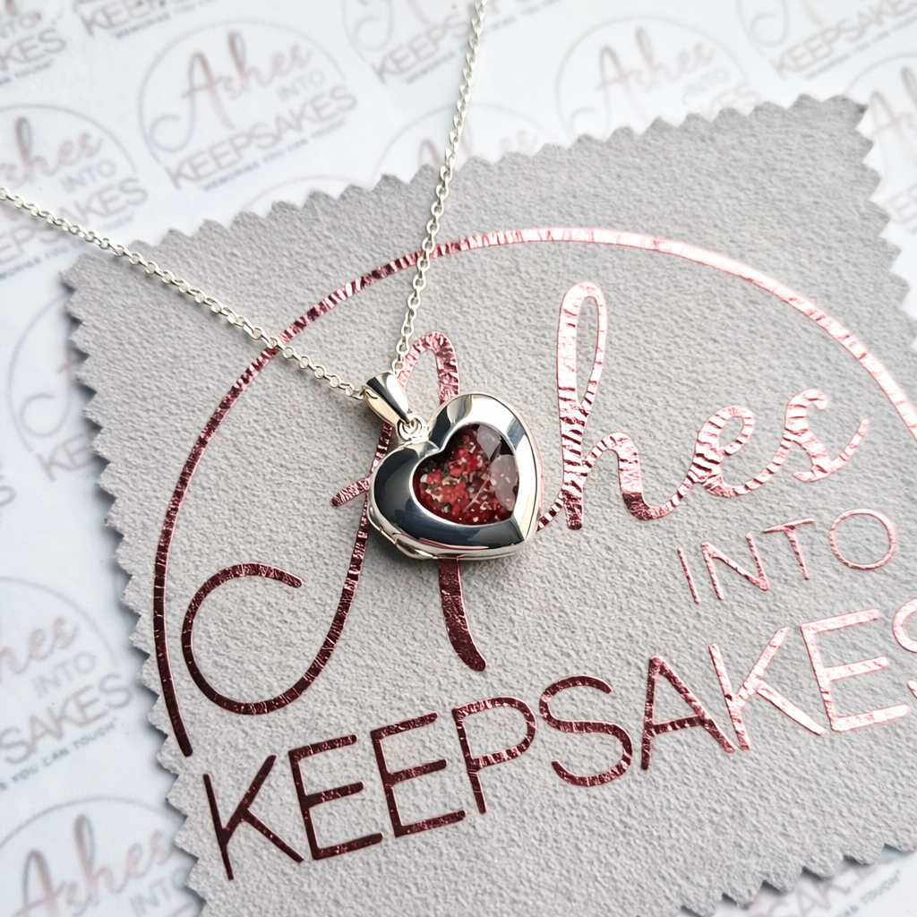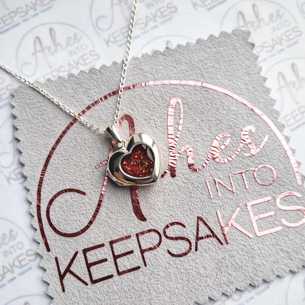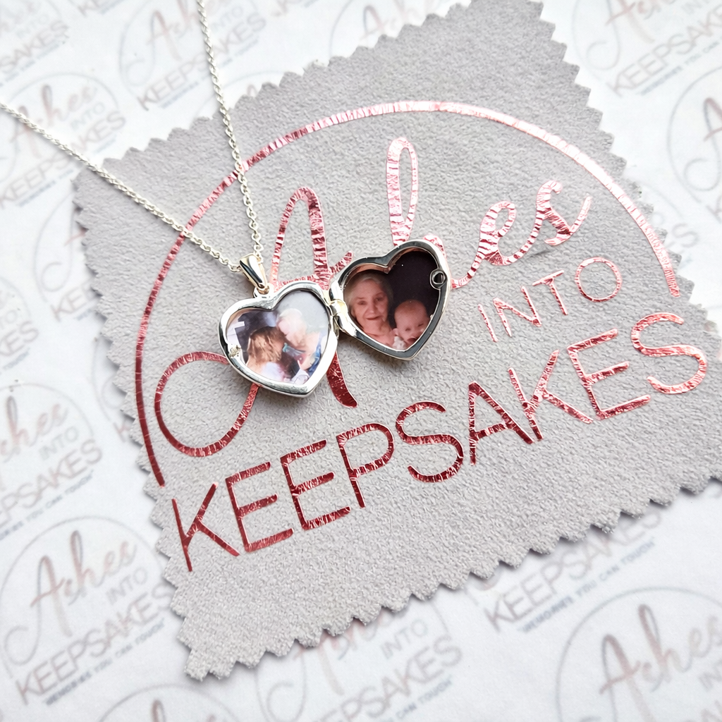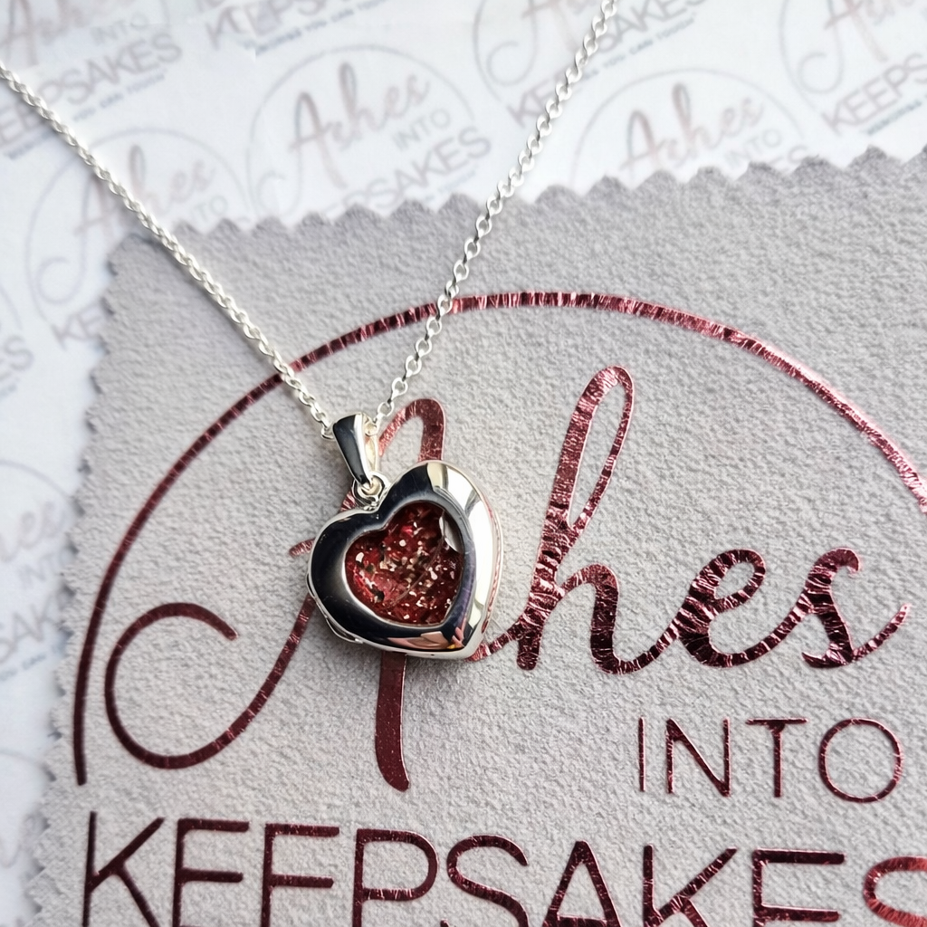 Cindy Heart Locket, can include memorial ashes inside a heart stone these beautiful lockets can include two individual pictures inside, you can send us the images via email if you would like us to print and put these inside for you. Comes in a choice of colours and can include your loved ones ashes, hair or pets fur. Add a touch of extra sparkle with the option of real diamond dust added to your jewellery, this is placed in between the layers of the stone and adds a subtle sparkle. Each pendant is hand crafted to order and we estimate all orders to take around 3-6 weeks from receiving your inclusion. All items come with authenticity certificate with your loved ones name on. Once you have placed and order with Ashes into keepsakes we will send out a pack for you to send your ashes, hair or pets fur back to us, any unused will be returned to you with your order. The completed product will be expertly buffed to create a mirror shine finish, and due to the range of colours we have to choose from no two resin gems are ever the same. Ashes into keepsakes is committed to each one of our customers to provide the best service and care. Your loved ones ashes, hair or even pets fur will be handled with the utmost respect and care, and any unused will be sealed and returned to you with your order. Your orders will be sent to you with a special authenticity certificate with your loved ones name on and the creation date, then hand signed by our designer. To take care of your resin inlaid product, do not expose it to extreme temperatures, if this happens at any point we advise to just leave it sit at room temperature for a small amount of time. We advise to remove when showering, swimming or handling cleaning products. Make sure to not store in direct sunlight. The pendants shine can be restored using a silver polishing cloth, any damage after you have received your jewellery we accept no liability for this, please read on how to care for your jewellery ensuring it lasts a lifetime. We offer a no refunds policy, this is because once your order is placed any jewellery will begin being produced ready for when your inclusion arrives to us. Speedy service is available at the checkout this guarantees your order for a specific date, this needs to be agreed before adding to cart please email us.