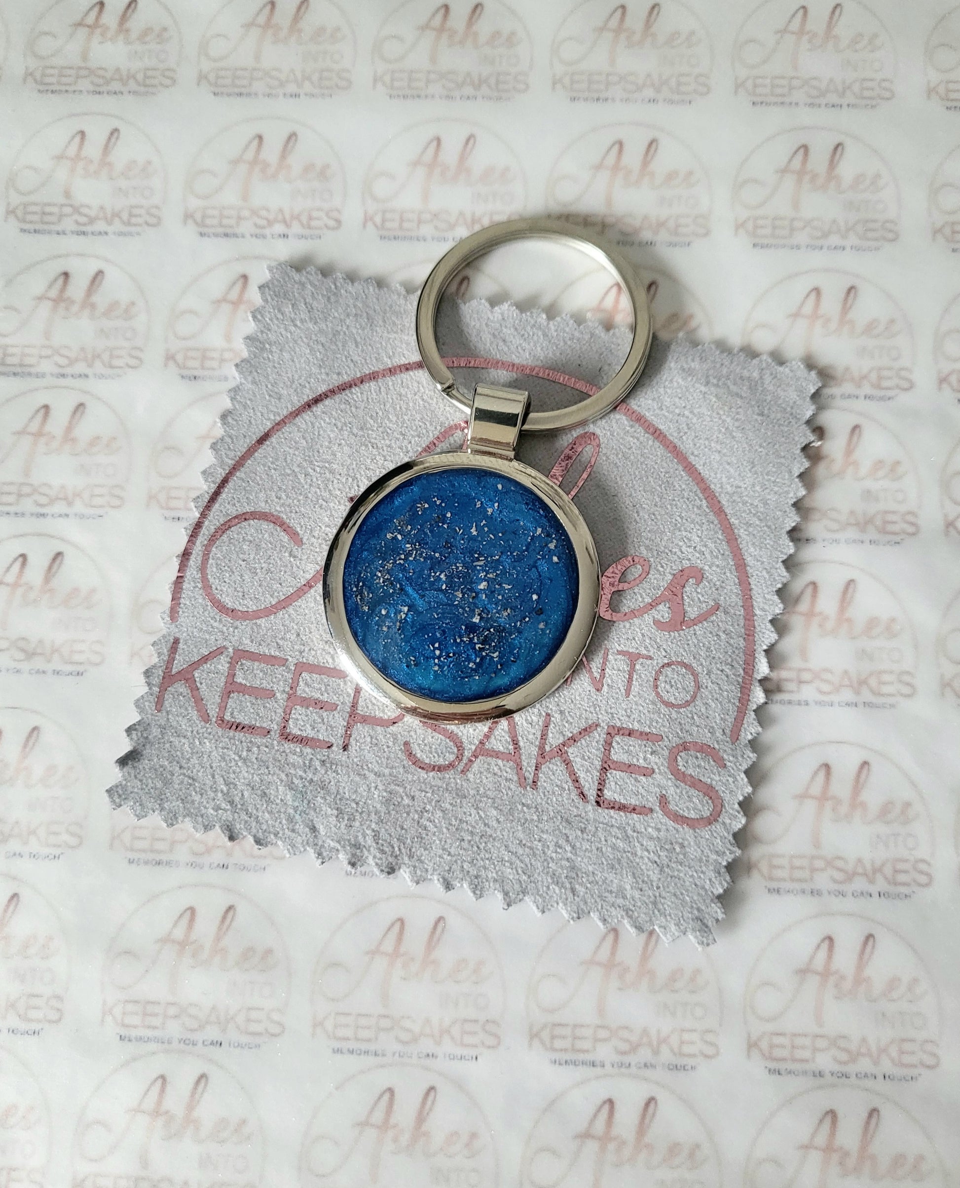 Stainless steel memorial ashes keyring, comes in a choice of colours and can include your loved ones ashes, hair or pets fur. Add a touch of extra sparkle with the option of real diamond dust added to your product, this is placed in between the layers of the stone and adds a subtle sparkle.
