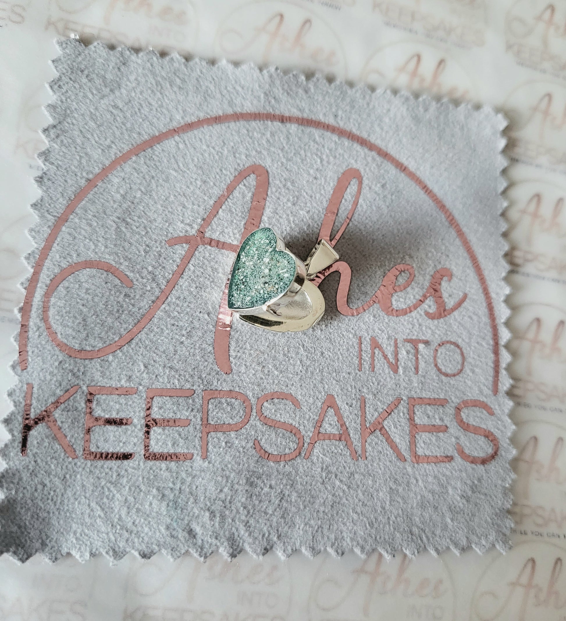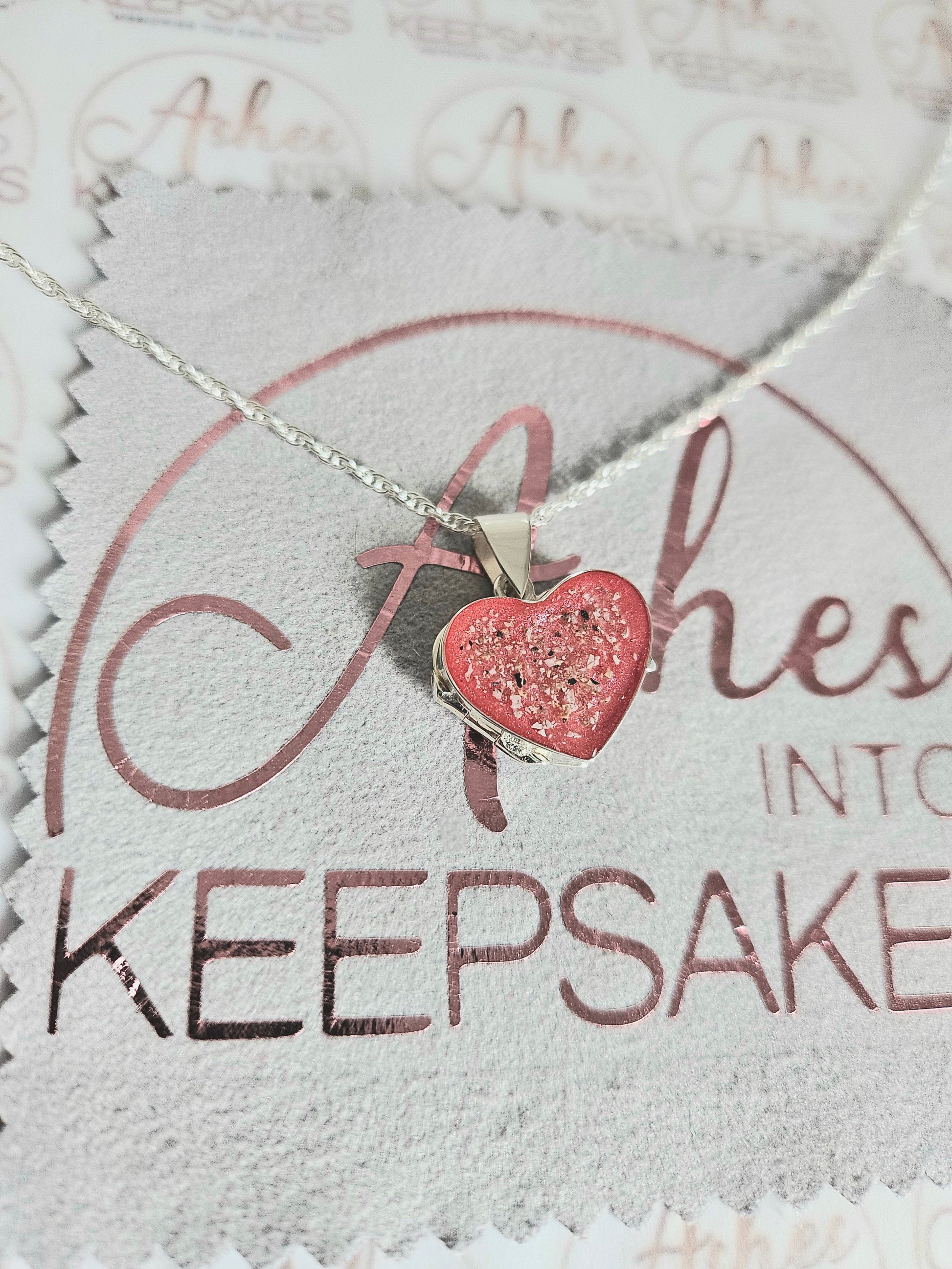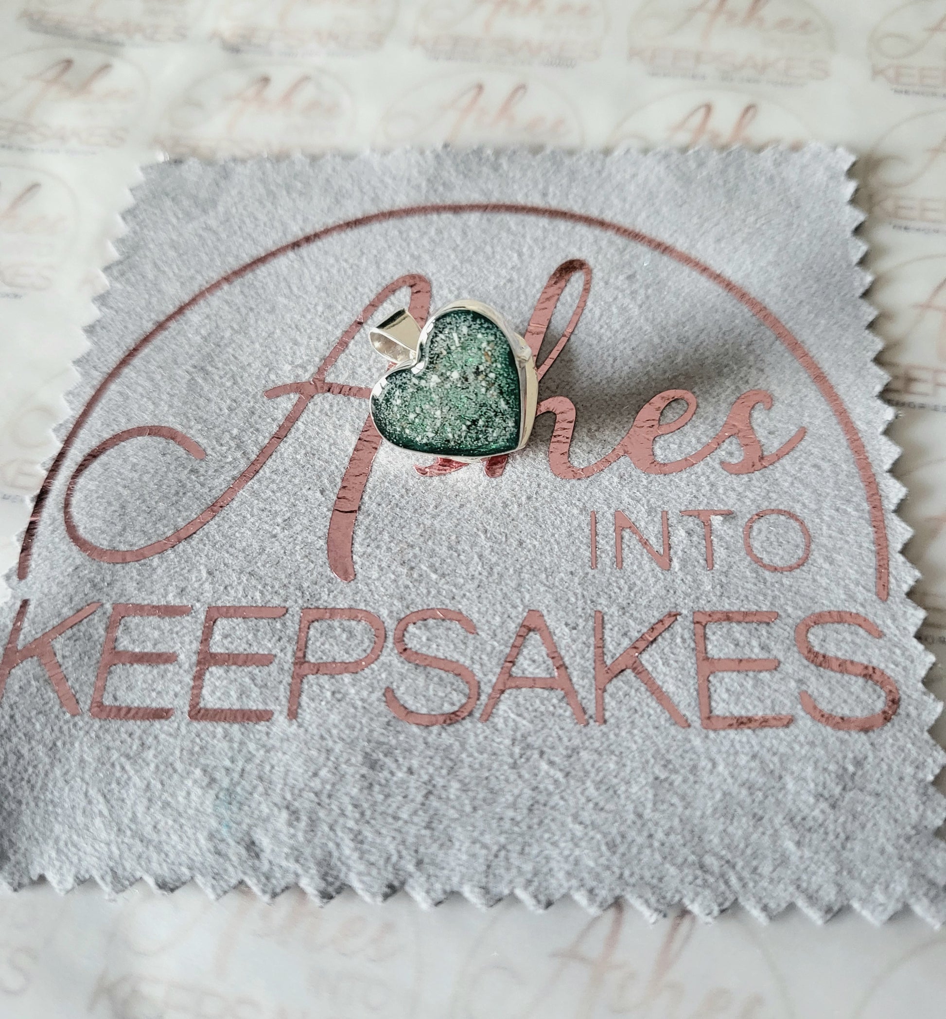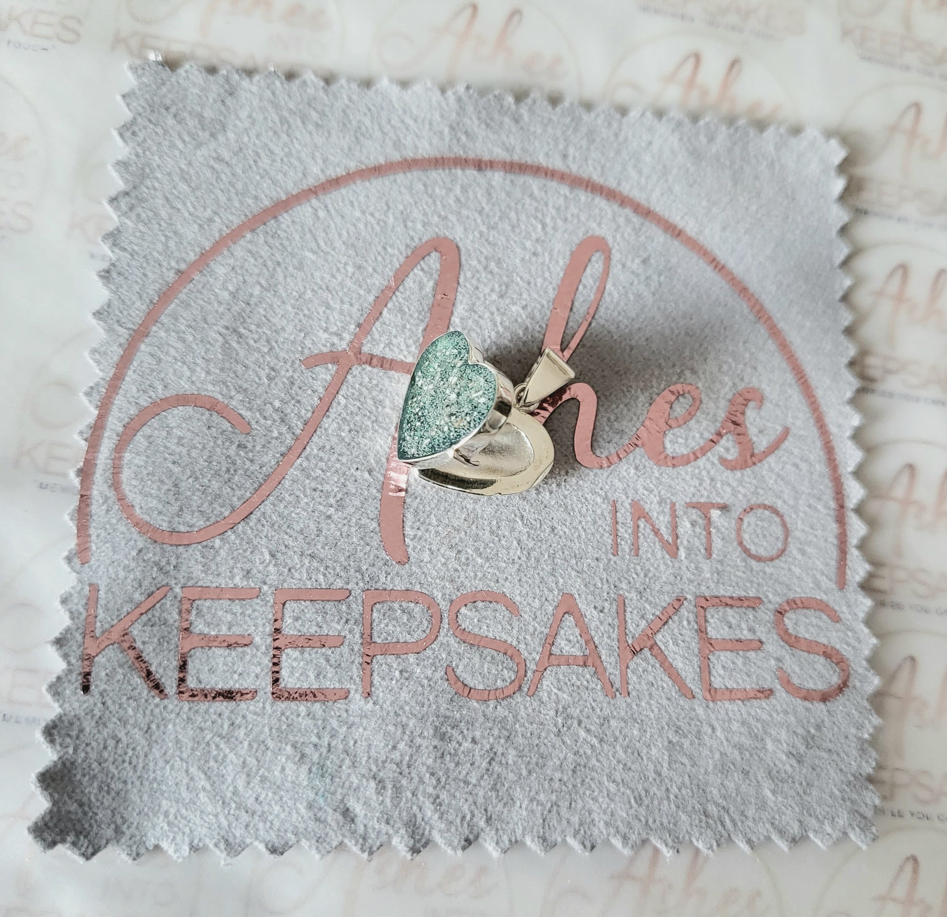 Sterling silver memorial heart locket pendant. Comes in a choice of colours and can include your loved ones ashes, hair or pets fur. Add a touch of extra sparkle with the option of real diamond dust added to your jewellery, this is placed in between the layers of the stone and adds a subtle sparkle. Each pendant is hand crafted to order and we estimate all orders to take around 3-5 weeks from receiving your loved ones ashes or hair. All items come with authenticity certificate with your loved ones name on. Once you have placed and order with Ashes into keepsakes we will send out a pack for you to send your ashes, hair or pets fur back to us, any unused will be returned to you with your order. The completed product will be expertly buffed to create a mirror shine finish, and due to the range of colours we have to choose from no two resin gems are ever the same. Ashes into keepsakes is committed to each one of our customers to provide the best service and care. Your loved ones ashes, hair or even pets fur will be handled with the utmost respect and care, and any unused will be sealed and returned to you with your order.