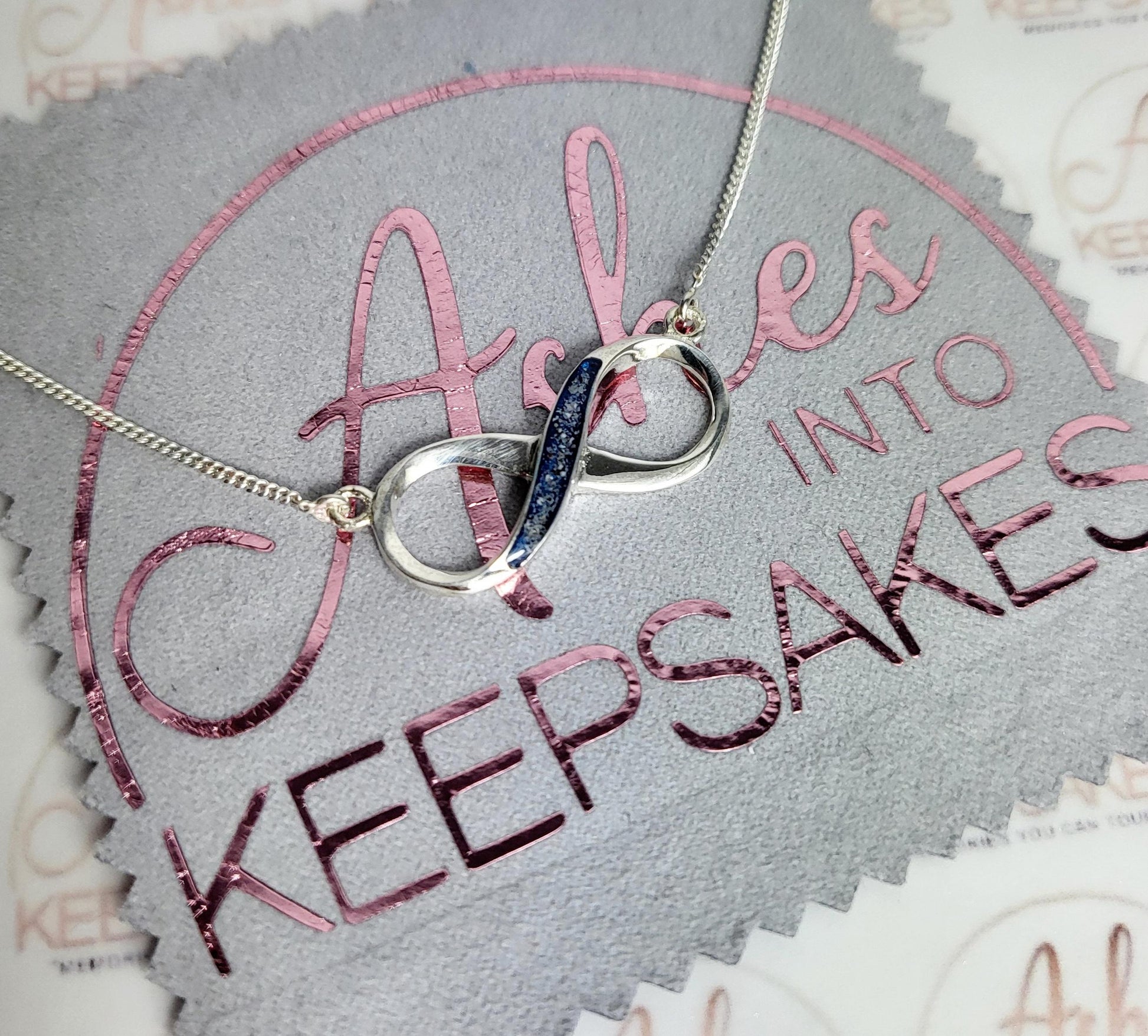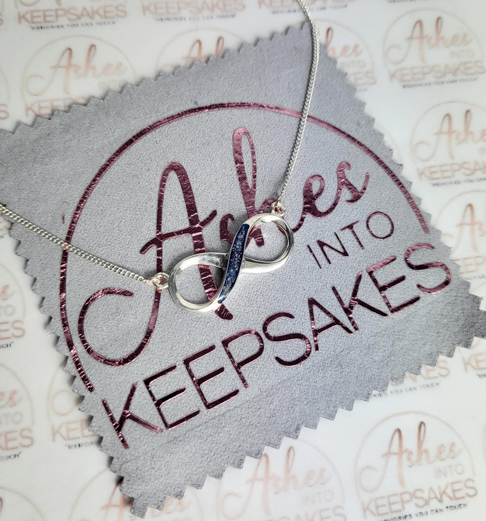 Sterling silver memorial infinity pendant for the inclusion of cremation ashes. Comes in a choice of colours and can include your loved ones ashes, hair or pets fur. Add a touch of extra sparkle with the option of real diamond dust added to your jewellery, this is placed in the top layer of the stone and adds a subtle sparkle. Each pendant is hand crafted to order and we estimate all orders to take around 3-5 weeks from receiving your inclusion, not from order date. All items come with authenticity certificate with your loved ones name on. Once you have placed and order with Ashes into keepsakes we will send out a pack for you to send your ashes, hair or pets fur back to us, any unused will be returned to you with your order. The completed product will be expertly buffed to create a mirror shine finish, and due to the range of colours we have to choose from no two resin gems are ever the same. Ashes into keepsakes is committed to each one of our customers to provide the best service and care. Your loved ones ashes, hair or even pets fur will be handled with the utmost respect and care, and any unused will be sealed and returned to you with your order.
