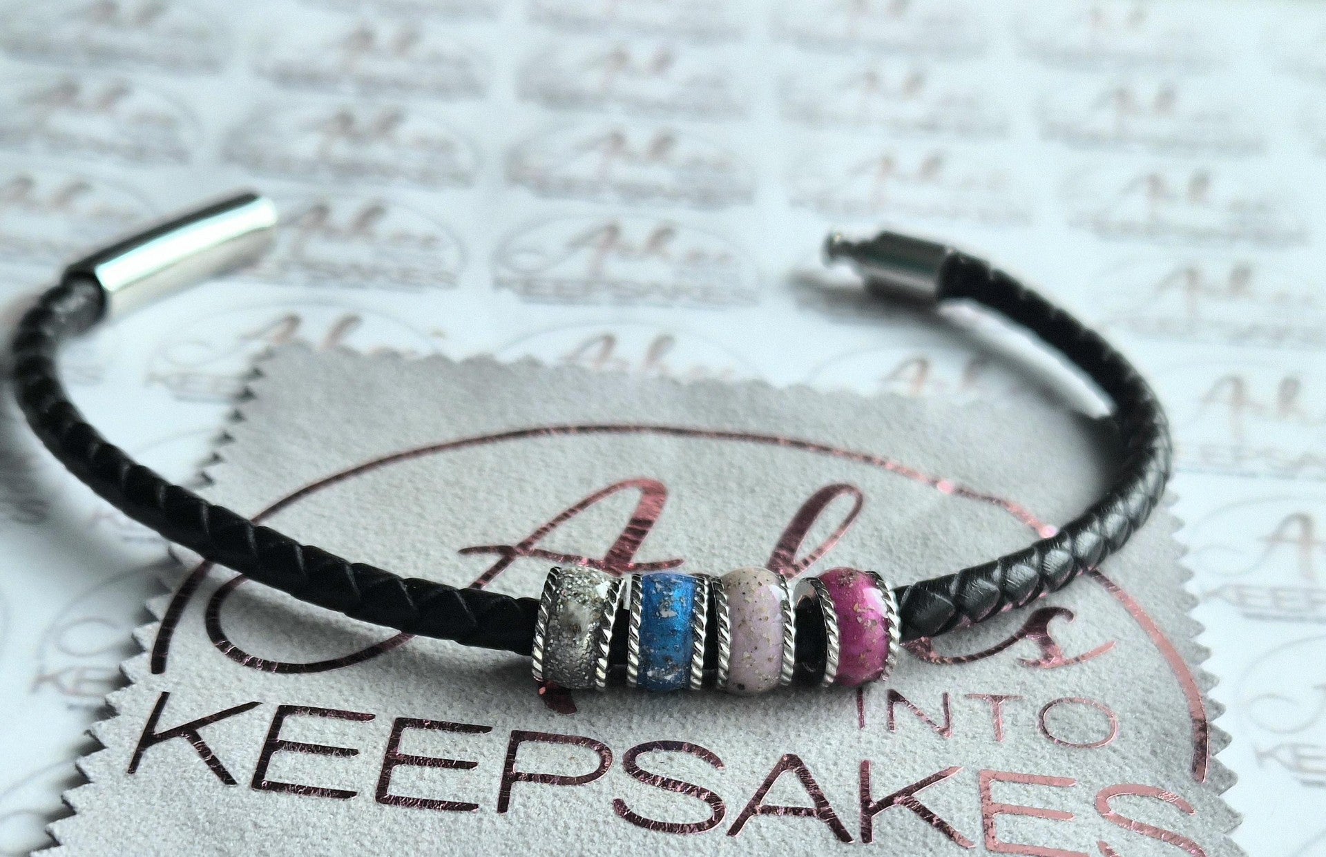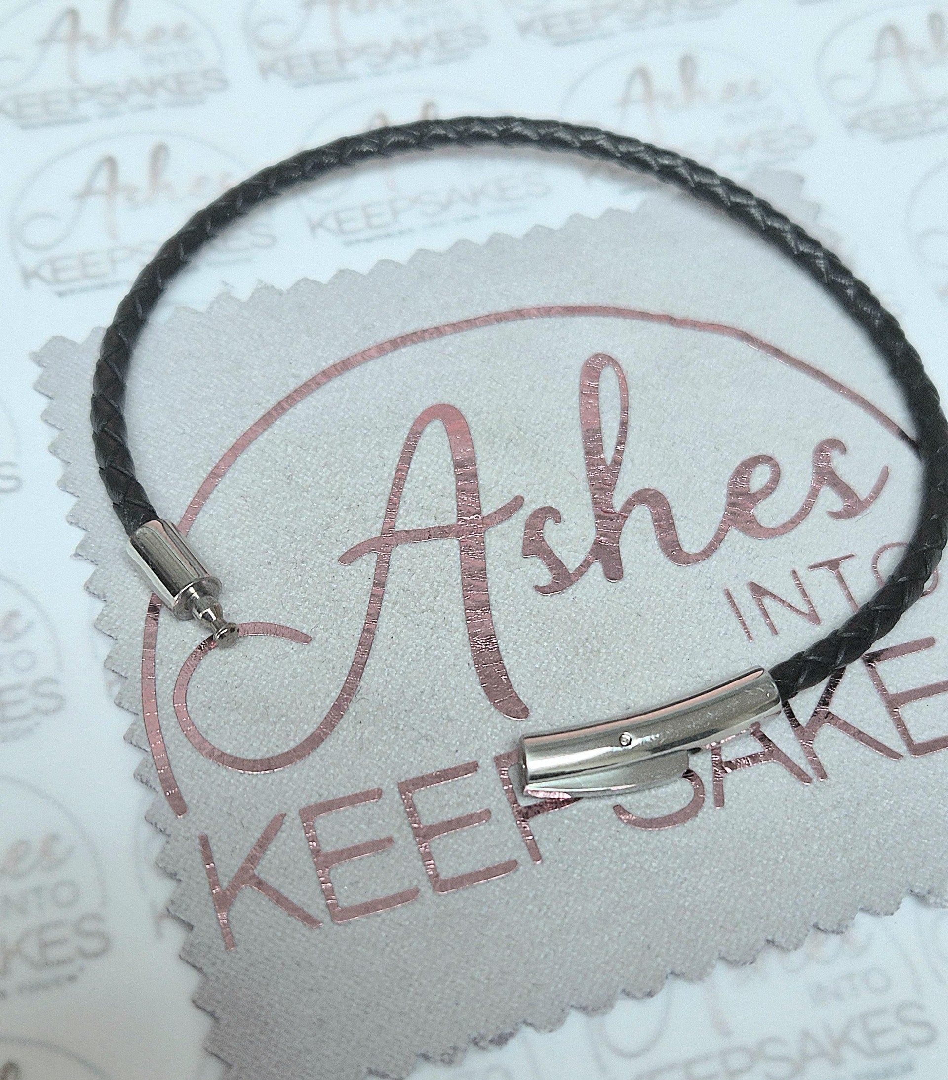 These beautiful leather bracelets can fit numerous charms on them and include different cremation ashes, hair or pets fur inside with your choice of colours.