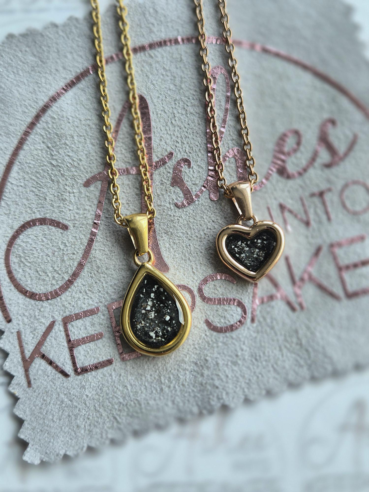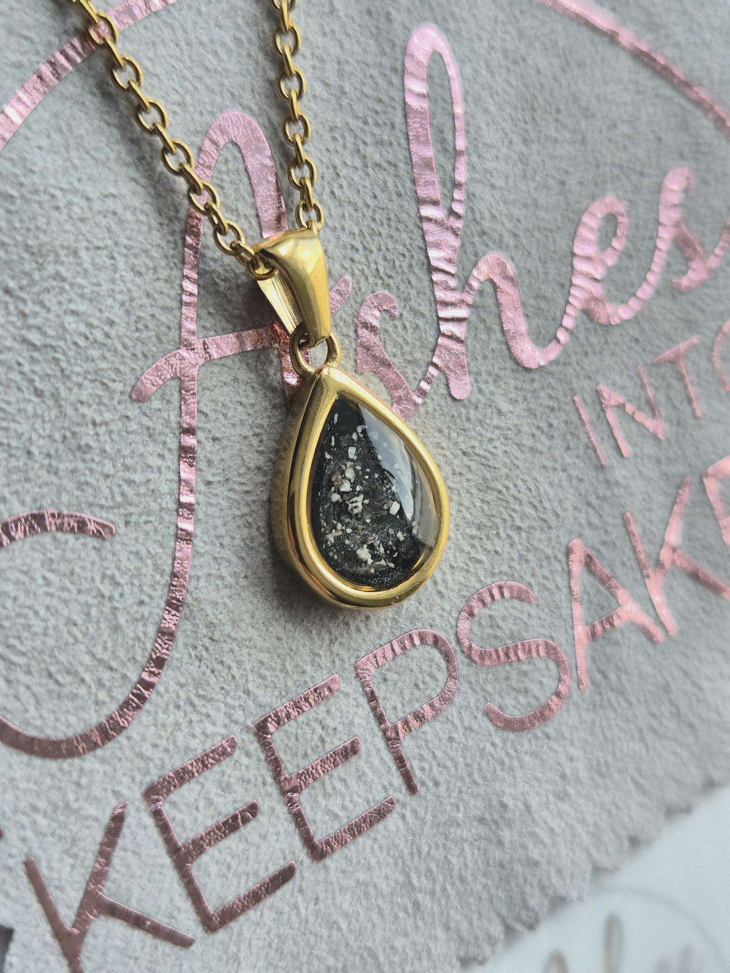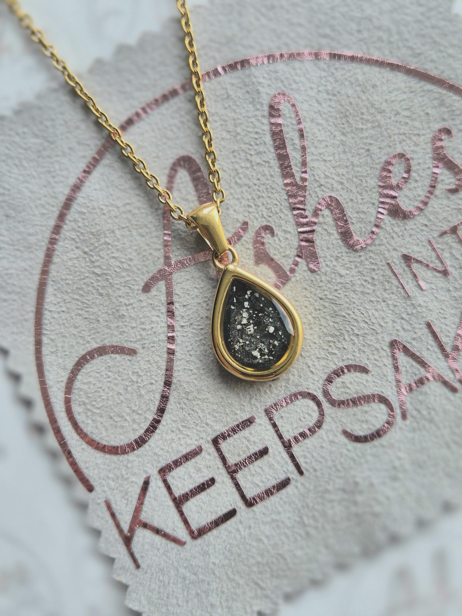 New Gold Sandra teardrop pendant with 18ct gold coating, these are approx 12mm x 15mm not including the bail, includes lightweight 18" trace chain. These are made of PVD, It stands for Physical Vapour Deposition, is is a way of adding a highly durable 18ct gold coating to stainless steel, titanium and other metal products. It is more durable and much longer lasting than traditional gold electroplating. Add a touch of extra sparkle with the option of real diamond dust added to your jewellery, this is placed in between the layers of the stone and adds a subtle sparkle. Each of these pendants is hand crafted to order and we estimate all orders to take around 3-6 weeks. All items come with authenticity certificate with your loved ones name on. Once you have placed and order with Ashes into keepsakes we will send out a pack for you to send your ashes, hair or pets fur back to us, any unused will be returned to you with your order. Please note if you are requesting a ring sizer, this could delay your order slightly whilst we are awaiting confirmation of your size. The completed product will be expertly buffed to create a mirror shine finish, and due to the range of colours we have to choose from no two resin gems are ever the same. Ashes into keepsakes is committed to each one of our customers to provide the best service and care. Your loved ones ashes, hair or even pets fur will be handled with the utmost respect and care, and any unused will be sealed and returned to you with your order.