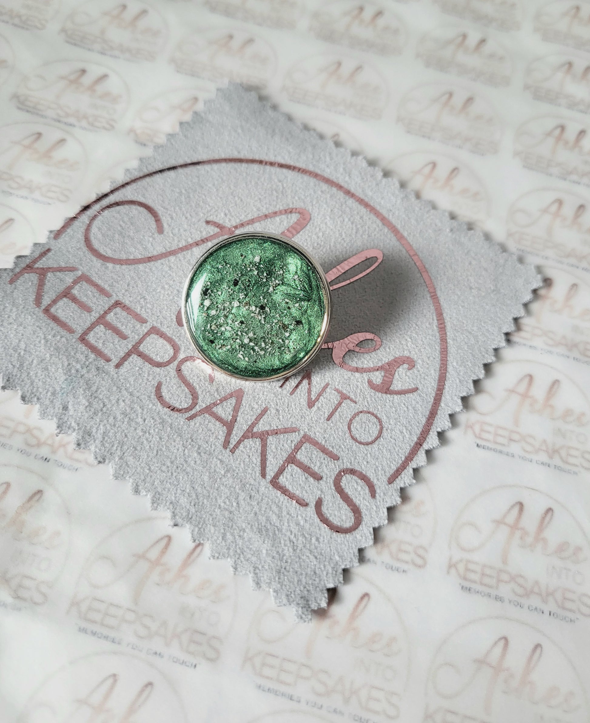 These silver memorial pins can include cremation ashes or hair inside with your choice of colours you can have a mix of ashes and hair. Add a touch of extra sparkle with the option of real diamond dust added to your product, this is placed in between the layers of the stone and adds a subtle sparkle.