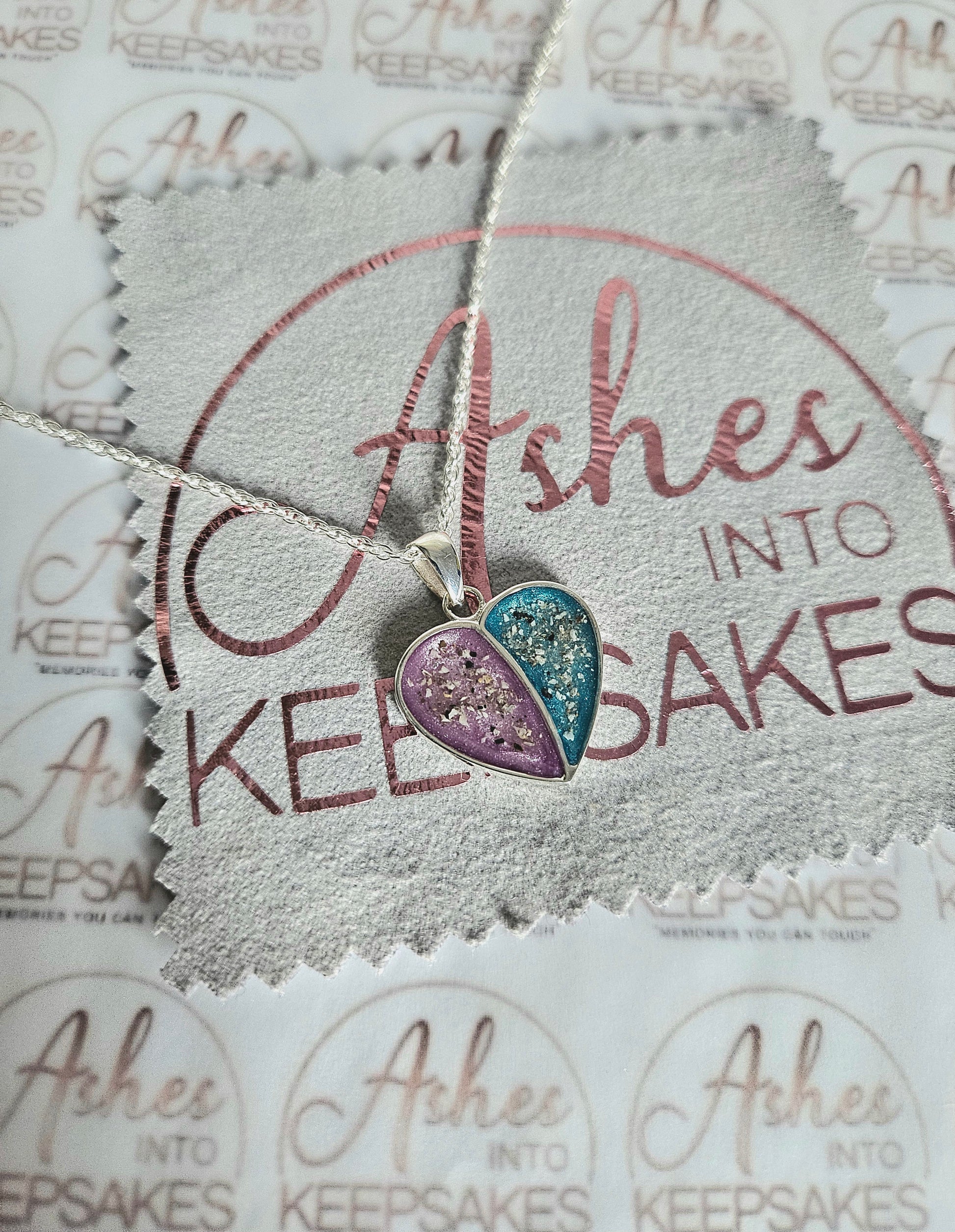 These come on a belcher 18" chain, Sterling silver half and half heart pendant. Comes in a choice of colours and can include your loved ones ashes, hair or pets fur. Add a touch of extra sparkle with the option of real diamond dust added to your jewellery, this is placed in between the layers of the stone and adds a subtle sparkle.
